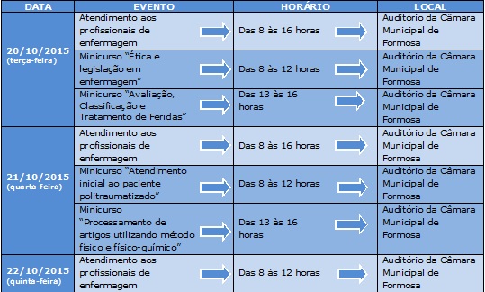 O Conselho Regional de Enfermagem de Goiás informa que será realizada, de 20 a 22 de outubro, a 2ª edição do projeto “Coren vai até você”, em Formosa, na Câmara Municipal do Município, que fica na Praça Rui Barbosa nº 70, Centro, CEP 73.801-220. Todas as atividades programadas visam atender os profissionais de enfermagem de Formosa e dos municípios vizinhos. Além de atendimento presencial, serão realizadas também minicursos, resoluções de dúvidas e acolhimento de sugestões.